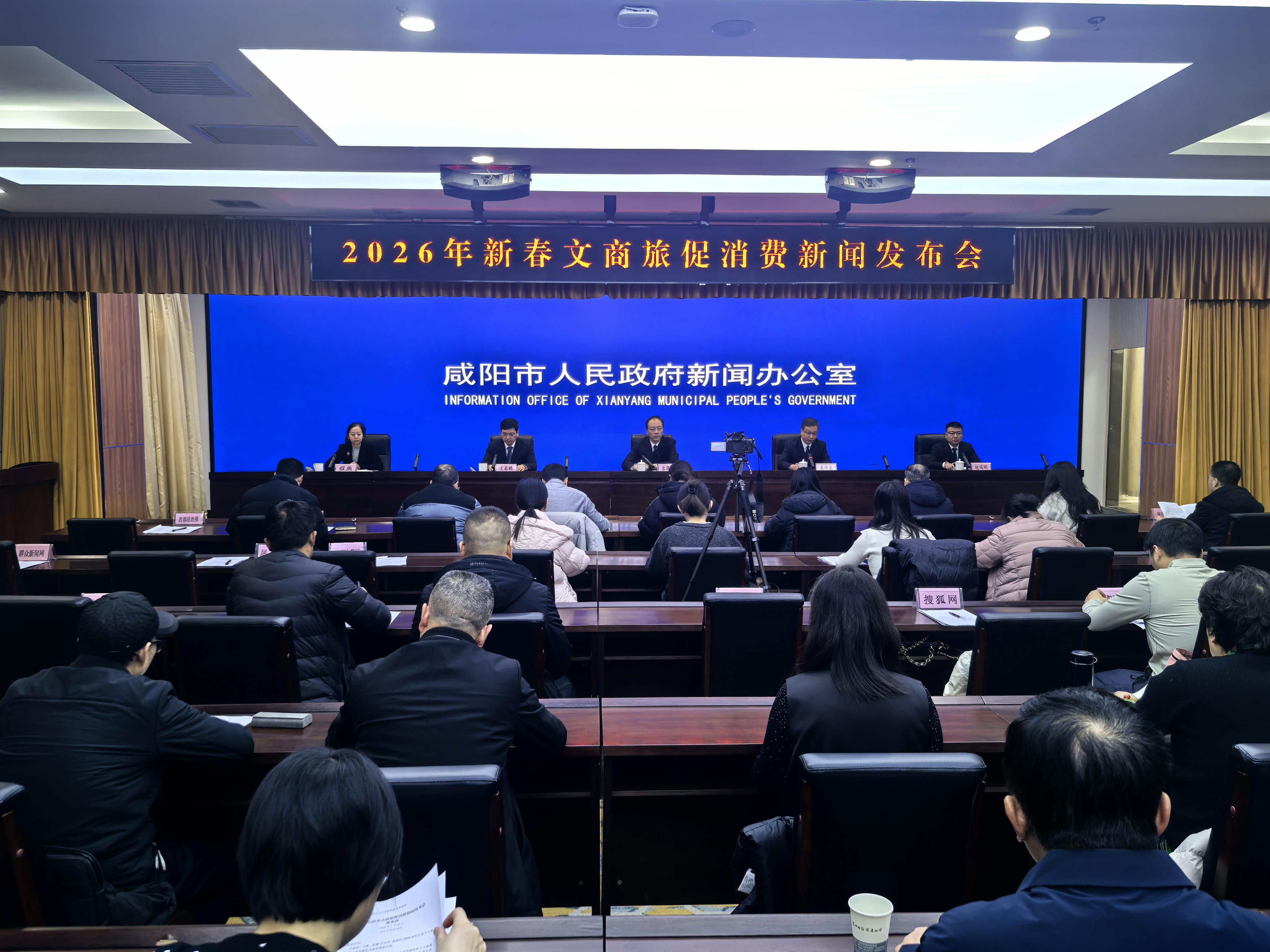 新春将至,年味渐浓。1月28日,咸阳市召开2026年新春文商旅促消费新闻发布会,全面通报春节期间全市文商旅促消费系列活动安排、重点举措及筹备情况,凝聚政企合力,激活消费动能,为市民游客献上一场年味十足、精彩纷呈的文旅消费盛宴,助力全市经济高质量发展。咸阳市商务局副局长豆蓬勃、市文化和旅游局副局长展续垚、渭城区政府副区长王春鹏、礼泉县委常委、副县长赵瑞刚出席发布会,中省市媒体记者、省市县区两级人大代表政协委员及网络达人共同参会。